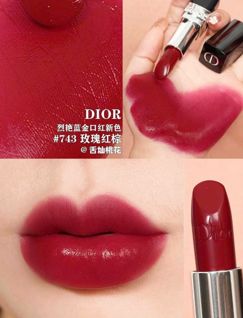 - Nổi bật với sắc đỏ rực rỡ pha ánh hồng , kiêu sa, Dior 743 là biểu tượng cho vẻ đẹp quyến rũ và quyền lực của người phụ nữ.