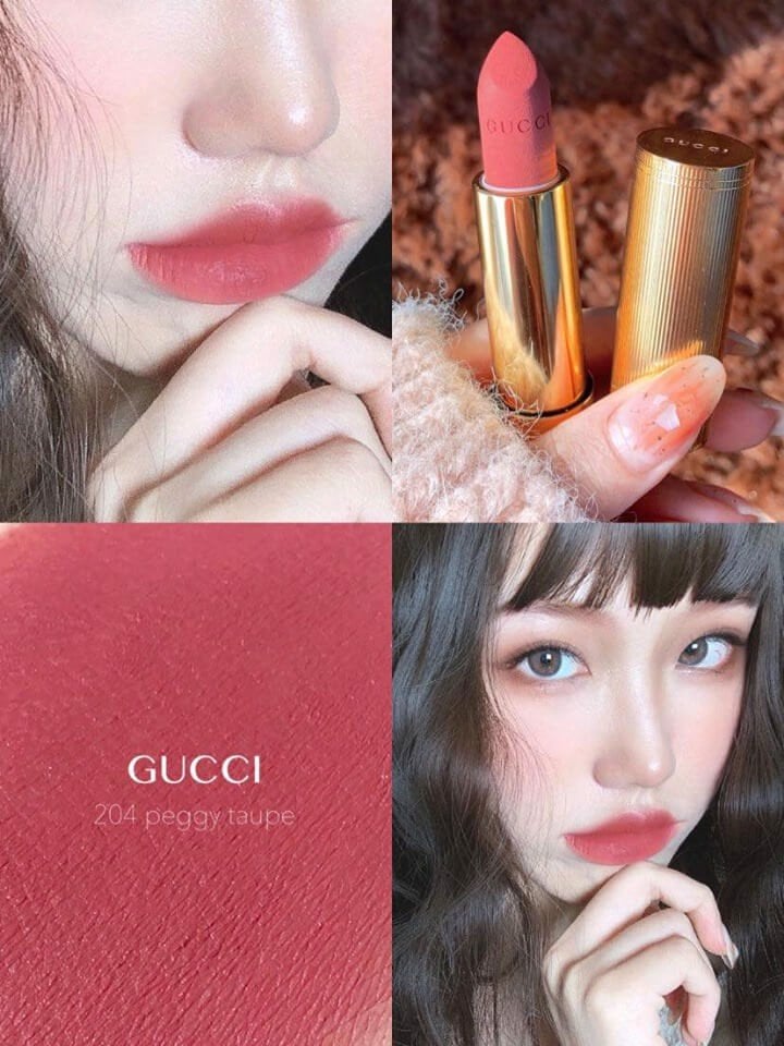- Son Lì Gucci 204 Peggy Taupelà một màu mới nhất của hãng Gucci, với màu 204 hồng đất khi lên khá nhẹ nhàng và trong trẻo. Nếu thích lối makeup trong trẻo tự nhiên như không thì màu son này sẽ rất hợp với bạn.